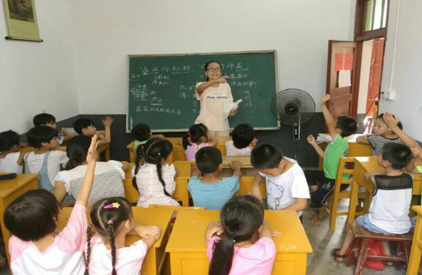 烈日下孩子们的脸颊上晕开一层层淡淡的腮红,但掩不住他们对我们的热情和期待,来到荷塘小镇的第一个下午我们便展开了准备已久的支教活动。“坐观垂钓者,徒有羡鱼情”,志愿者银文在课堂上为大家讲述的是诗人孟浩然求官的坎坷经历;“学而不思则罔,思而不学则殆”,志愿者伍园园在课堂上为大家讲述的是孔子的学习方法;志愿者李锦新则教着六年级的孩子们如何换算古代的货币......学习从来都是一件辛苦的事,教室如摆在火焰上的一架蒸笼,孩子们的汗水混着墨汁渗在作业本上,但脸上却洋溢着幸福的表情,仿佛在告诉志愿者们:“读书是一件快乐的事,你们便是给我们带来快乐的人”。