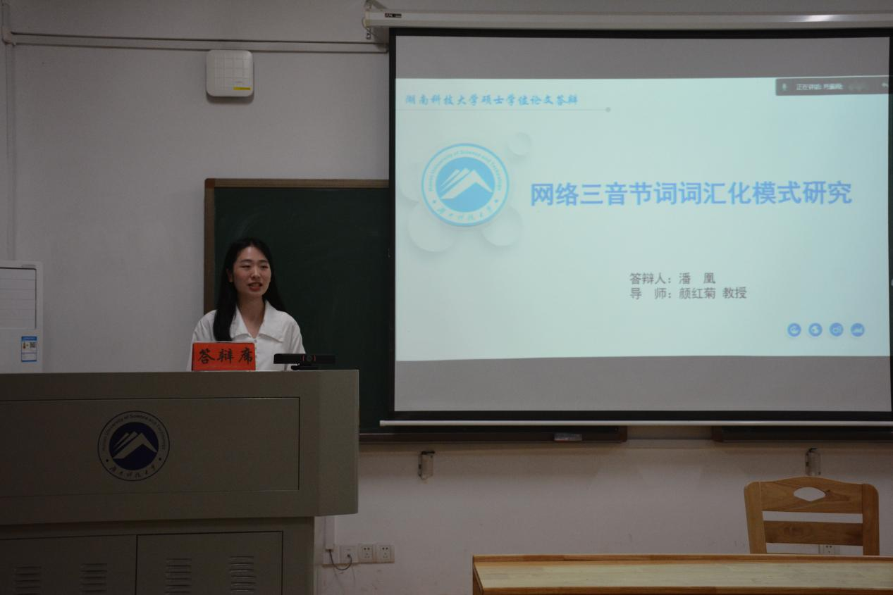 潘凰同学的硕士论文为《网络三音节词词汇化模式研究》,该论文以网络三音节词为研究对象,观察新词的动态产生过程,通过对网络三音节词词汇化模式的研究,探讨词汇化模式对汉语扶持生成机制的联系,揭示词汇化模式的造词过程。覃远雄老师肯定了论文的选题,具有很强的研究价值。聂志军老师指出在文献综述方面要注意时代性和论文的相关性。